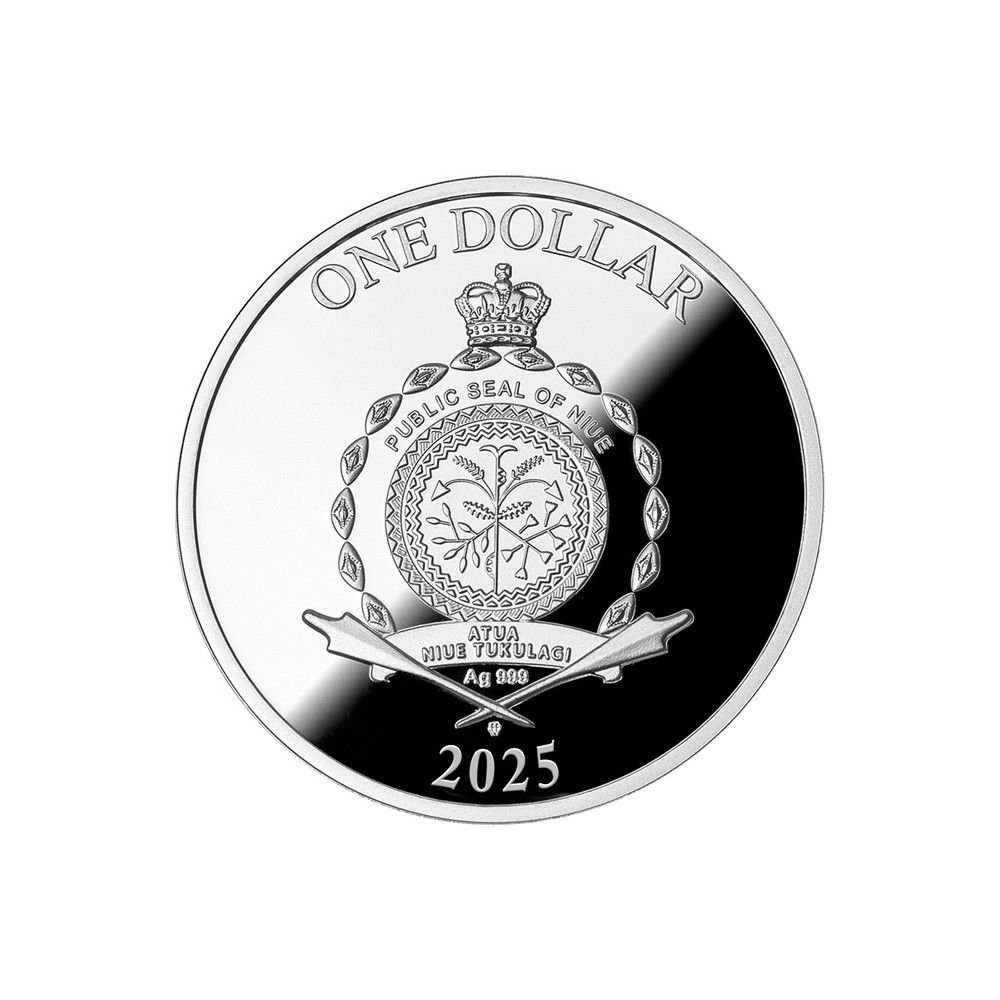 On the front of the coin you will find the Niue State Seal. The State Seal of Niue, the official emblem of the national government, displays a badge with native flora representing the island in the centre. This is surrounded by a ring of shells and crowned with a royal crown, which links the island to the Commonwealth.