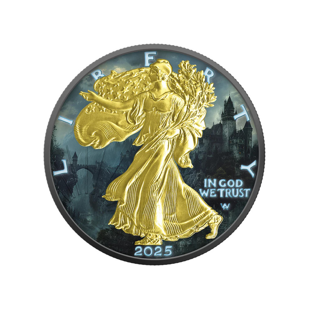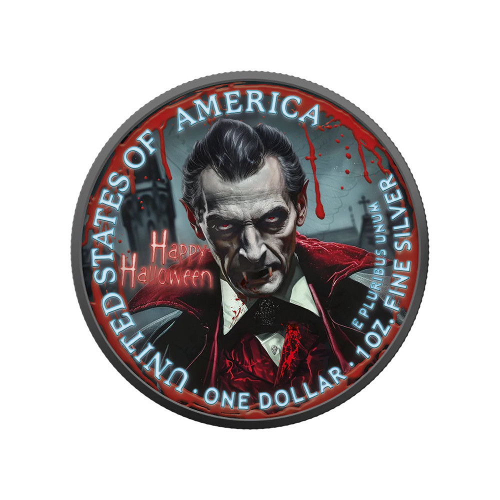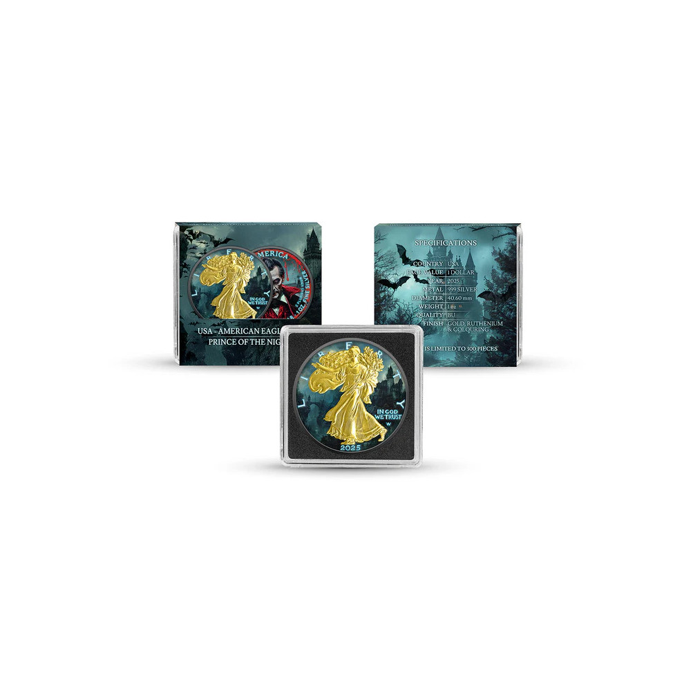 USA 2025 - American Eagle 1 Oz Silver Coin - Prince of the Night (gold, ruthenium, color) is a limited edition premium coin issued for Halloween. Each coin is crafted of 1 oz of genuine American Silver Eagle (999 purity) and then treated after minting with selective gold and ruthenium plating and vibrant colors for a dramatic collectible look. The coin is limited to 300 pieces worldwide and comes in a protective Quadrum capsule with personalized packaging and complete specifications.