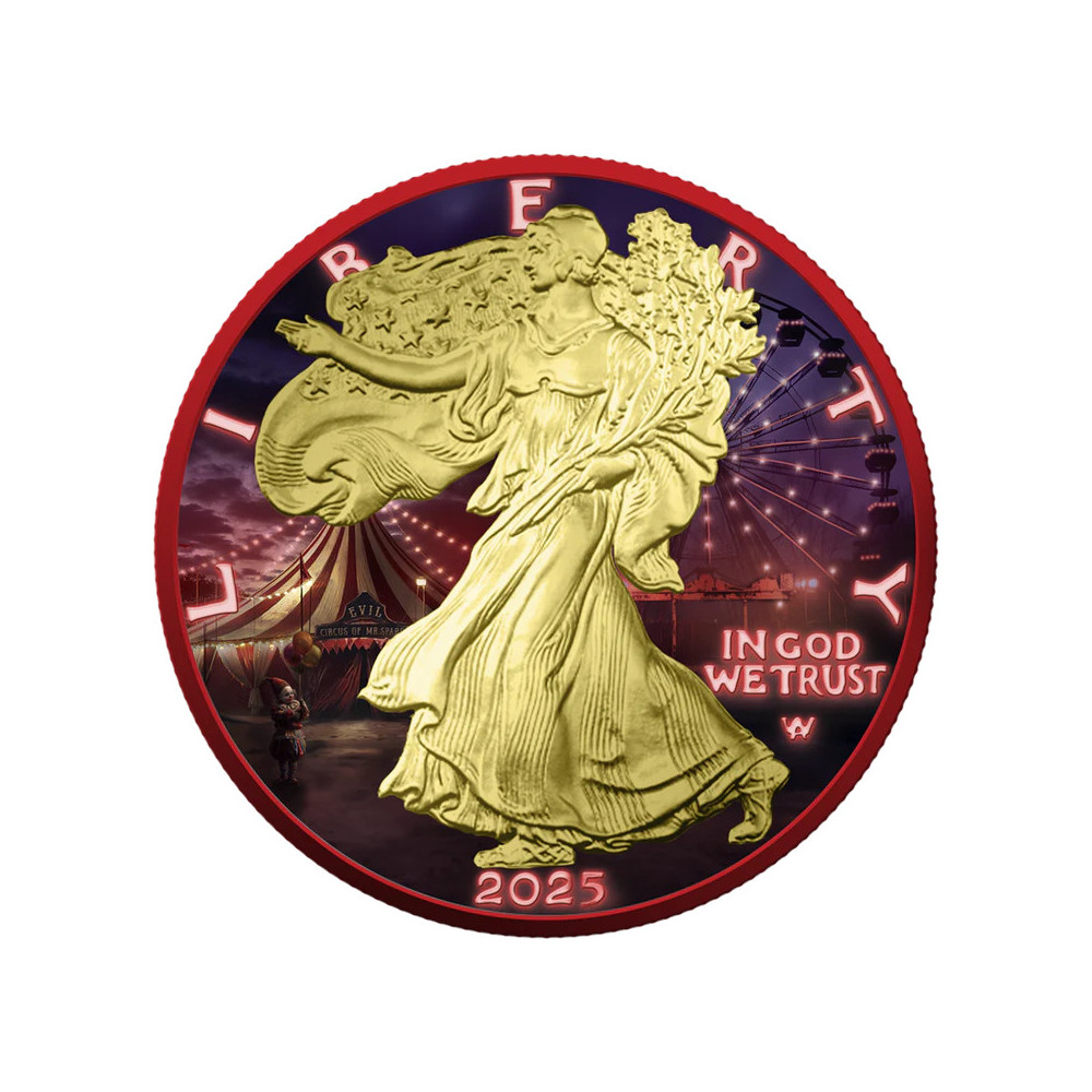 USA 2025 - American Eagle 1 oz Silver Coin - Creepy Smile (gold, space red, color) is a premium limited edition Halloween coin inspired by famous nightmare characters. Each coin is crafted from 1 oz of genuine American Silver Eagle (.999 purity) and then treated with vivid colors, Space Red effect and selective gilding after minting for a striking collectible look. This edition is limited to 300 pieces worldwide and comes in a protective Quadrum capsule with personalized packaging with matching artwork and specifications.