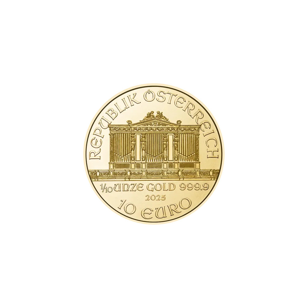 The Vienna Philharmonic owes its name to the famous Austrian orchestra, which is one of the best in the world. The front of the gold coin depicts the great organ of the Vienna Musikverein. The weight of 1/10 ounce, the fineness of 999.9, the year of mintage and the face value of 10 EURO are stamped below the organ. The inscription "REPUPLIK ÖSTERREICH" is stamped above it. On the reverse side, some of the musical instruments of the Philharmonic Orchestra are depicted and on the upper edge you can see the name of the orchestra and the gold coin "WIENER PHILHAMRONIKER". Similar to the above gold coins, the Vienna Philharmonic is available in 1 oz, 1/2 oz, 1/4 oz and 1/25 oz sizes.